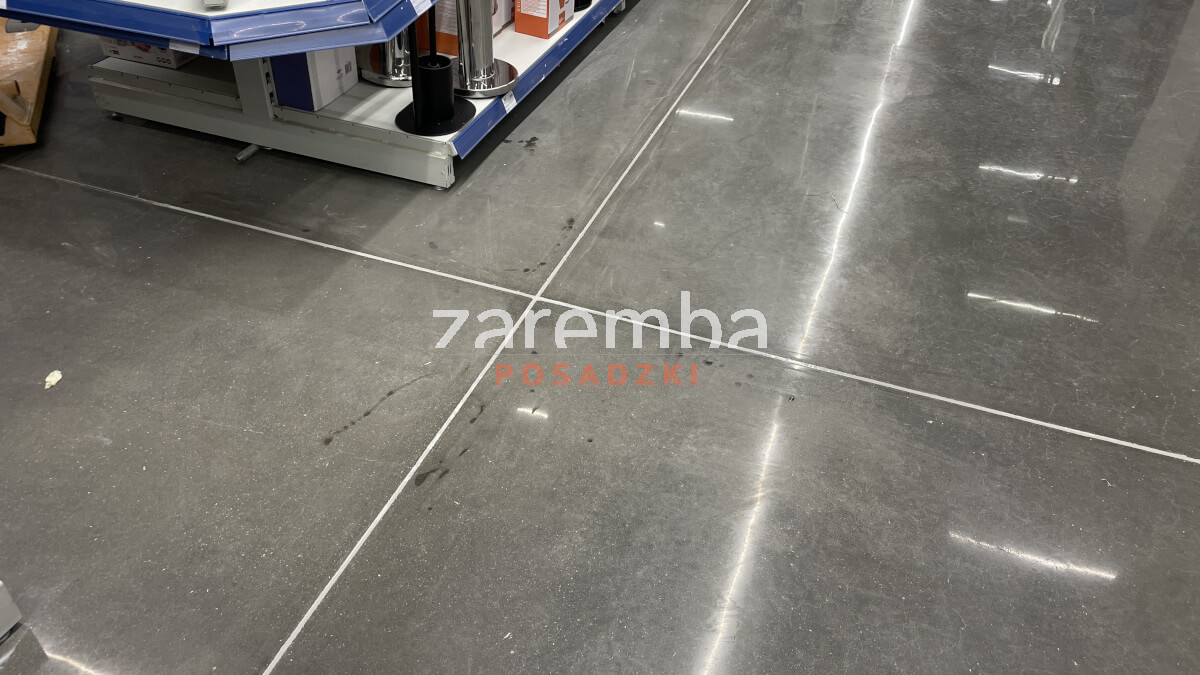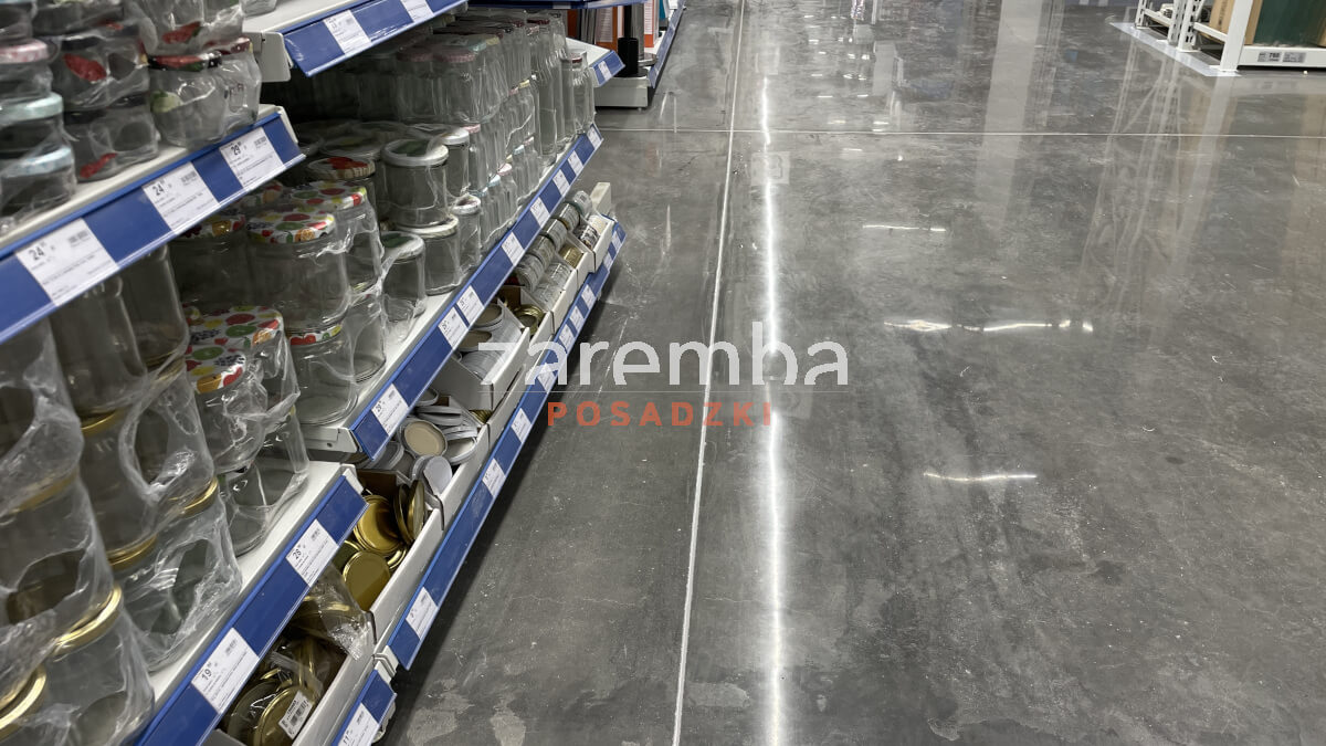 Mając na uwadze stan wyjściowy posadzki i wszystkie ograniczenia zastosowaliśmy technologię betonu polerowanego Silicol Renova. Jest to technologia polerowania betonu na mokro. Całkowicie bezwonna, całkowicie bezpyłowa. Prace były prowadzone w godzinach nocnych po zamknięciu sklepu przy pełnej współpracy załogi marketu. Pracownicy przesuwali regały sklepowe, abyśmy mogli wykonać regenerację posadzki. Następnie odstawiali je na miejsce, tak aby klienci mogli korzystać z możliwości robienia zakupów w normalnych godzinach funkcjonowania obiektu. Przy okazji regeneracji posadzki wymieniliśmy materiał elastyczny w dylatacjach. Przy regałach sklepowych, dla zachowania czystego odcięcia pomiędzy powierzchnię regenerowaną a miejscami, gdzie nie mogliśmy się już dostać z polerowaniem betonu, wykonaliśmy wymalowanie specjalną farbą do betonu polerowanego. W ten sposób udało się uzyskać bardzo estetyczny finisz.